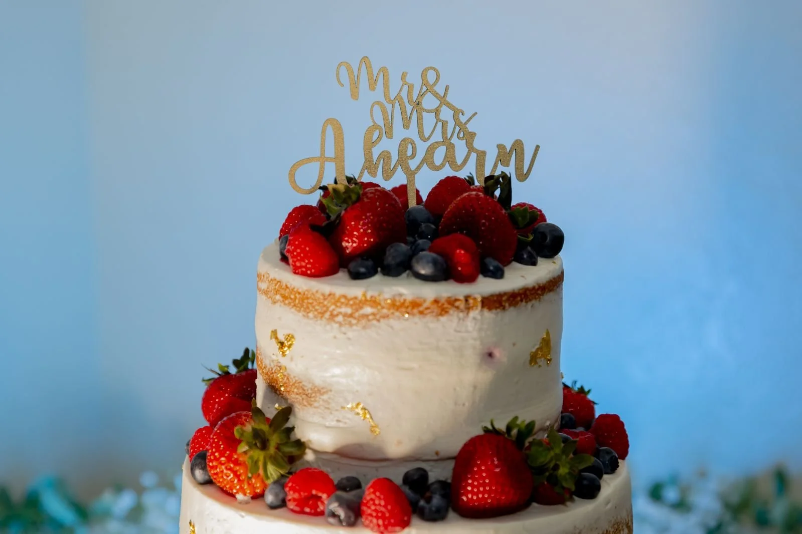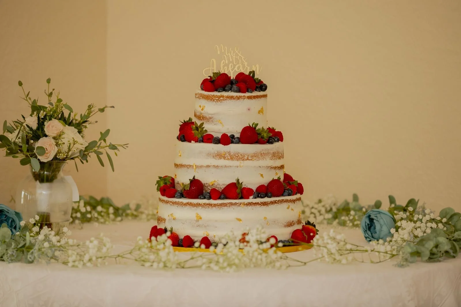 Vanilla wedding cake with Chantilly icing, which is mascarpone cheese, whipped cream and a little almond extract. Filled with a raspberry jam and fresh blueberries, strawberries, and raspberries with a hint of orange zest. Decorated with gold leaf.